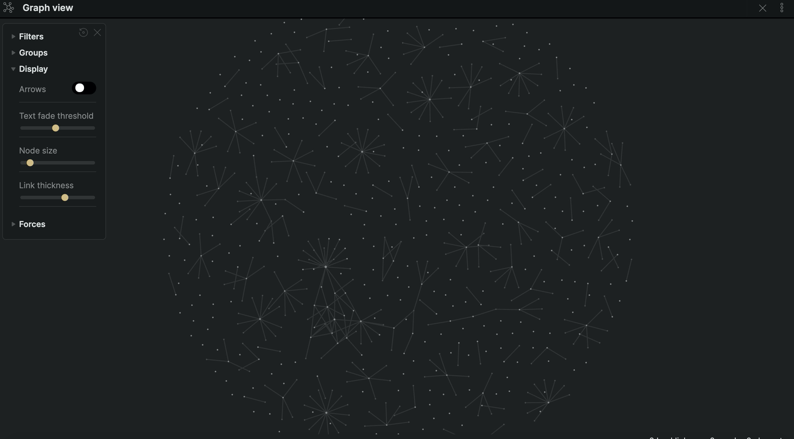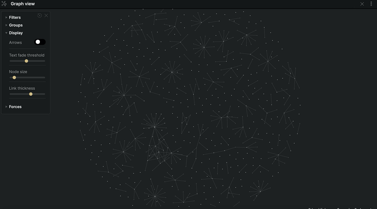 放一張使用 Obsidian 製作的圖片,它是目前我所有的筆記連結狀況。節點代表一則則的筆記,連線則代表筆記之間有被「連結」。