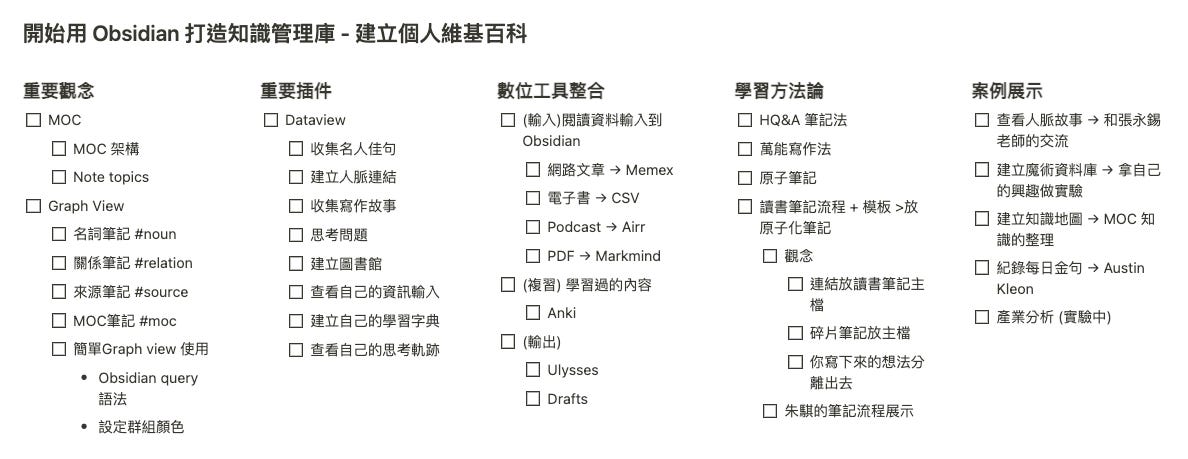 之後我會規劃更多「個人知識管理」的內容,下方是我目前的構想,內容都將會與 Obsidian 做結合。
