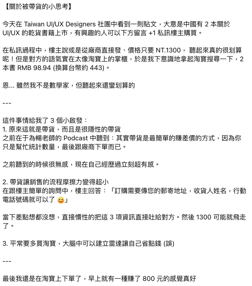 之前在于為暢老師的 Podcast 中聽到:其實帶貨是最簡單的賺差價的方式,因為你只是幫忙統計數量,最後跟廠商下單而已。