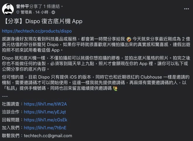 最近剛成為美國 2 億美元估值的新產品 - Dispo,主要復古膠卷拍攝體驗,使用者使用 Dispo App 拍照後無法立刻察看,需要等到隔天早上 9 點才能看到照片。由於此貼文有鎖社團權限,我直接貼圖: