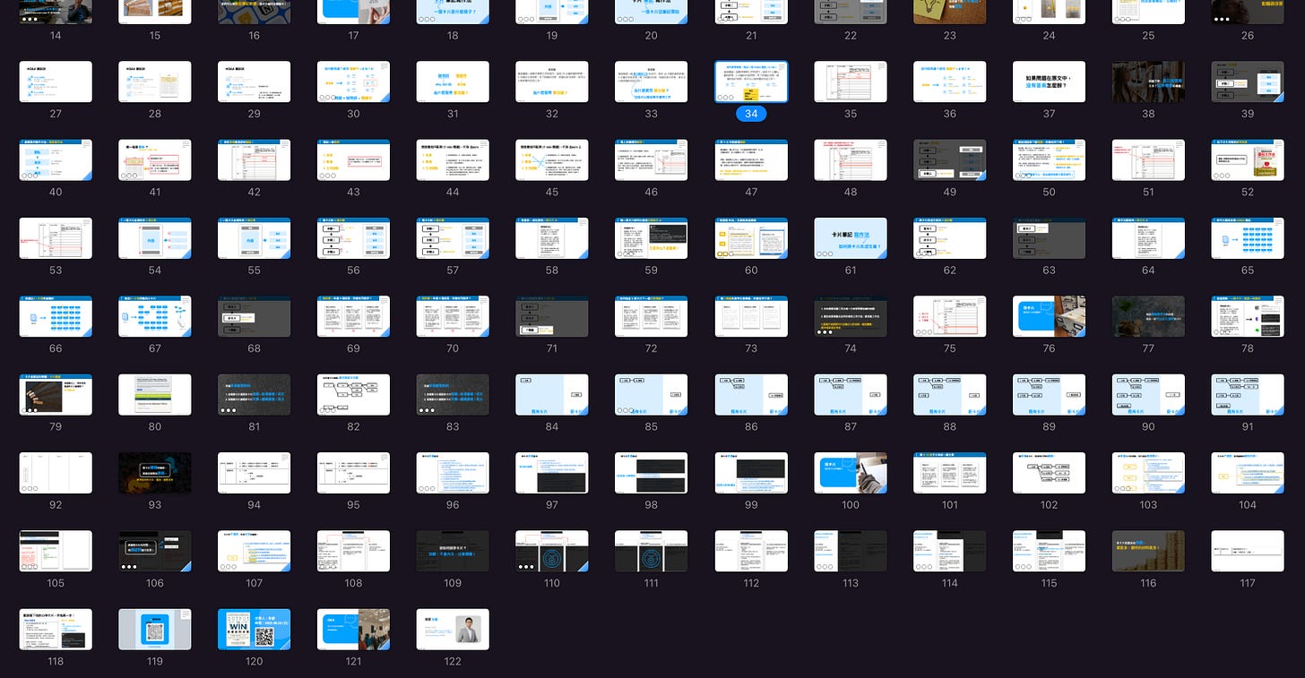 這場讀書會我會帶大家走完一次「寫卡片 → 用卡片創作」的流程。我做完投影片後發現...內容已經是課程等級的內容了(120 頁的投影片)!