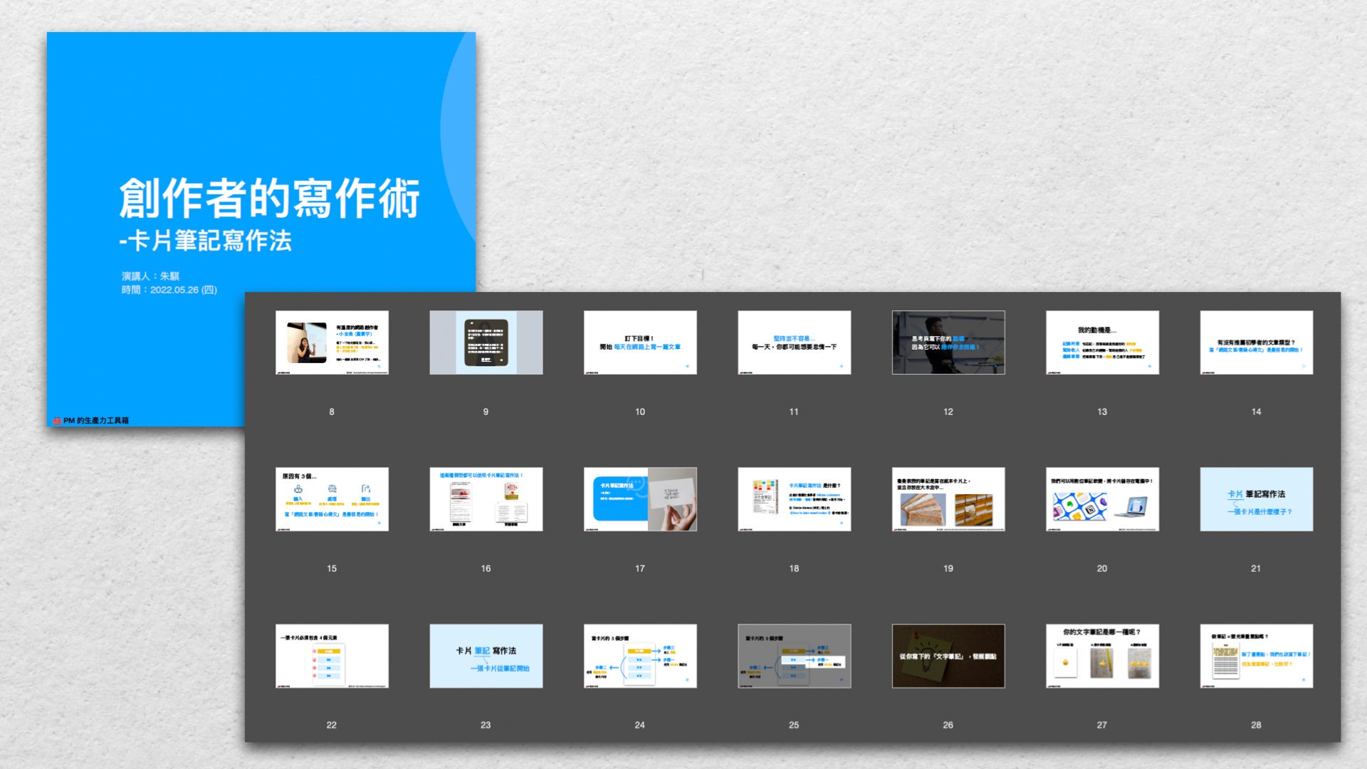 這是 2022 年我與放大知識學院共同舉辦的《創作者的寫作術》講座,簡報檔案共有 86 頁,不藏私的跟你分享我使用「卡片盒筆記法」創作內容的寫作方法。