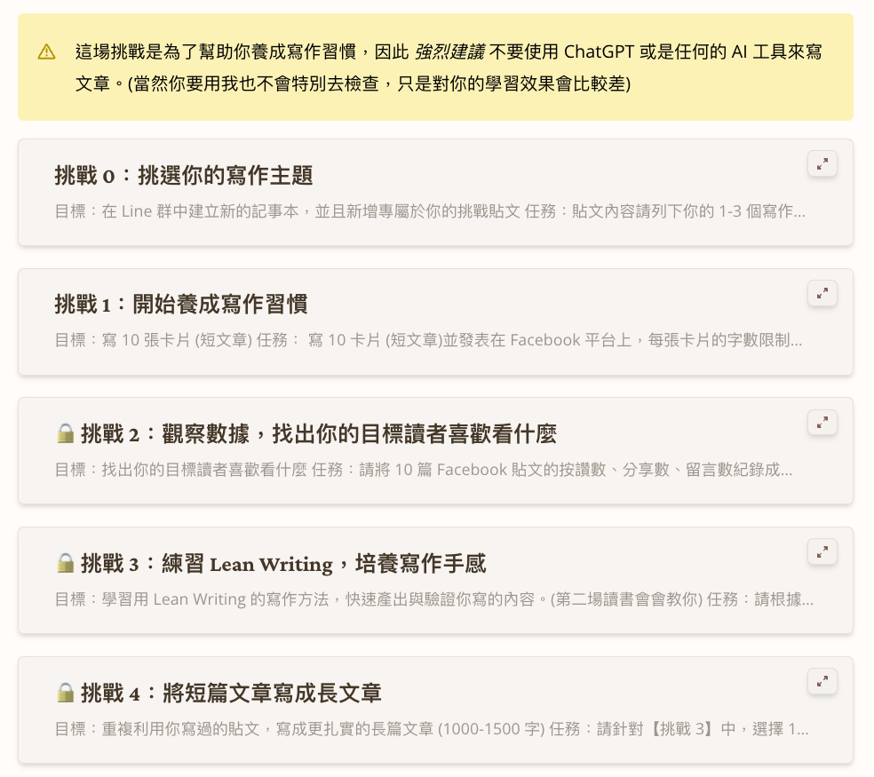 於是,我打算設計 4 場挑戰讓參加的朋友動手寫,寫完不但自己有產出、還有獎品可以拿!