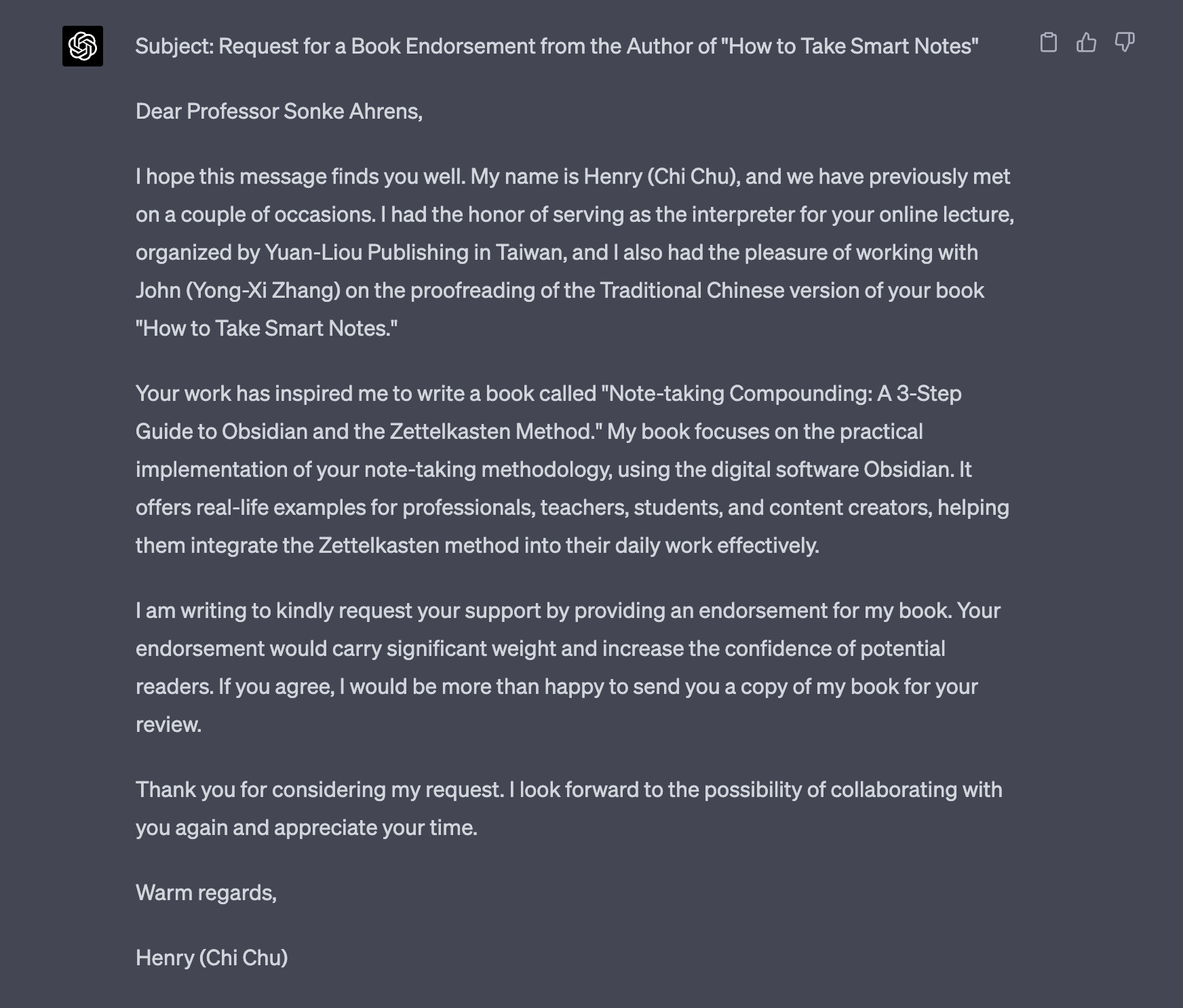 我想請《卡片盒筆記》的原作者 Sonke Ahrens 教授幫我寫推薦序或背書!
