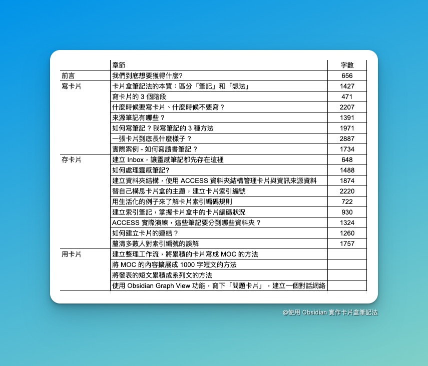 本週我都在衝刺寫書,題目是「使用 Obsidian 實作卡片盒筆記法」。
